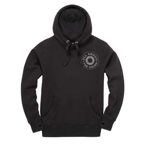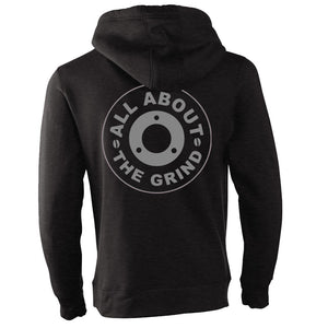 Heavyweight hoodie featuring the All About The Grind small chest logo and large back logo in grey print.