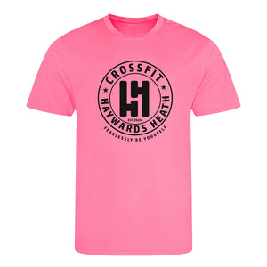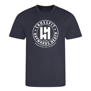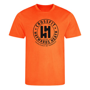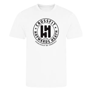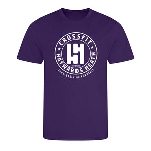 Sports fabric (sweat wicking) unisex t shirt featuring the CrossFit Haywards Heath logo on the front and ATHLETE printed on the back.