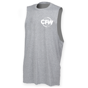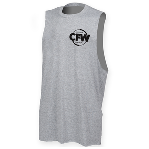 Mens muscle vest with deep arm holes featuring the CrossFit Witham Lincoln circle logo as a small left chest print