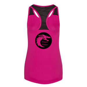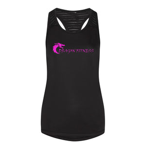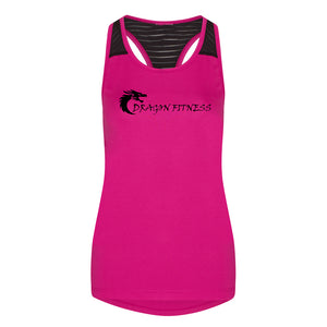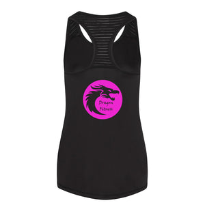 Ladies fit sports style racer back vest. Sweat wicking fabric. Featuring the Dragon fitness branding on the front chest and back