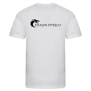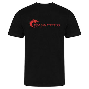 Printed with the Dragon Fitness left chest circle logo and long logo on the back.
